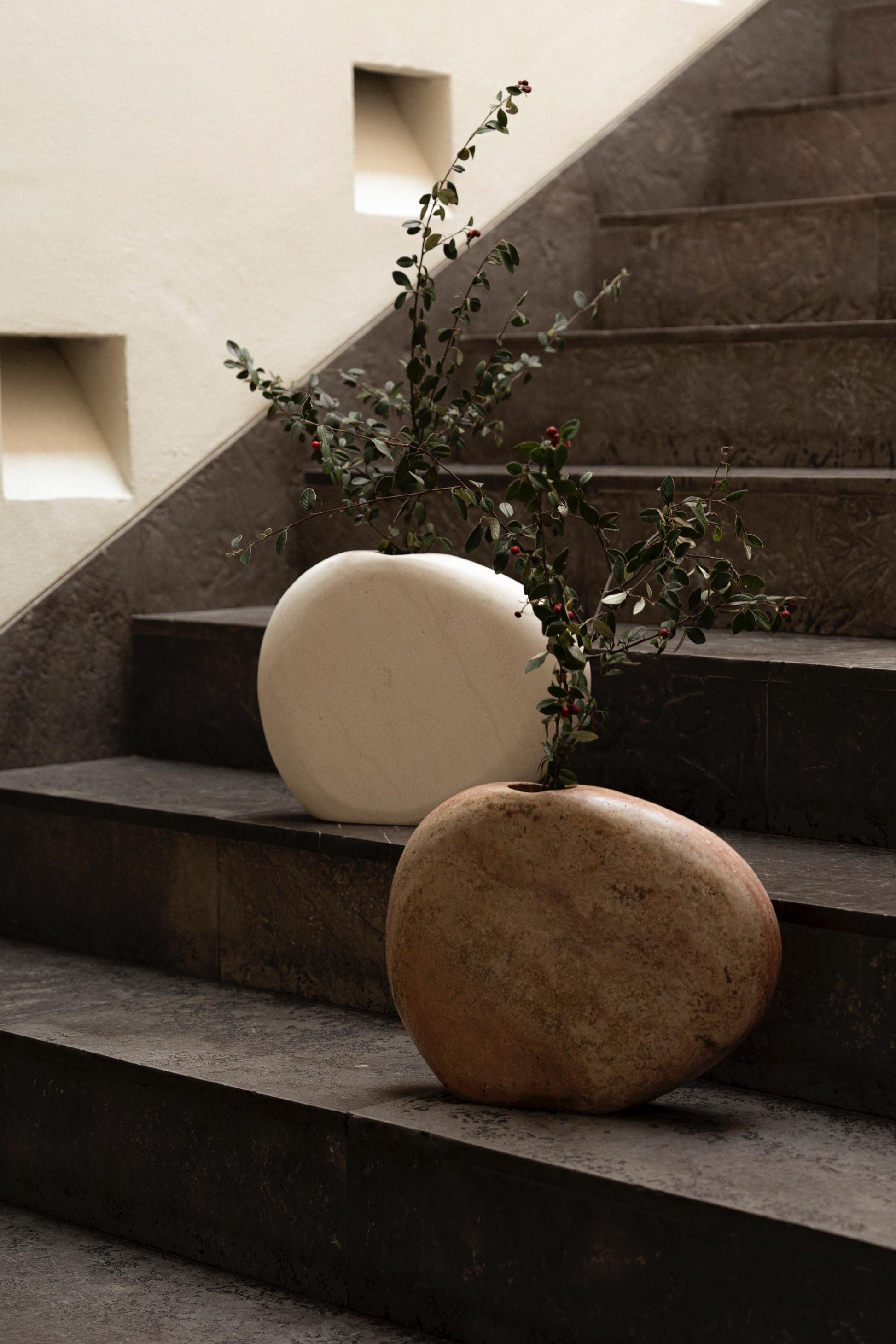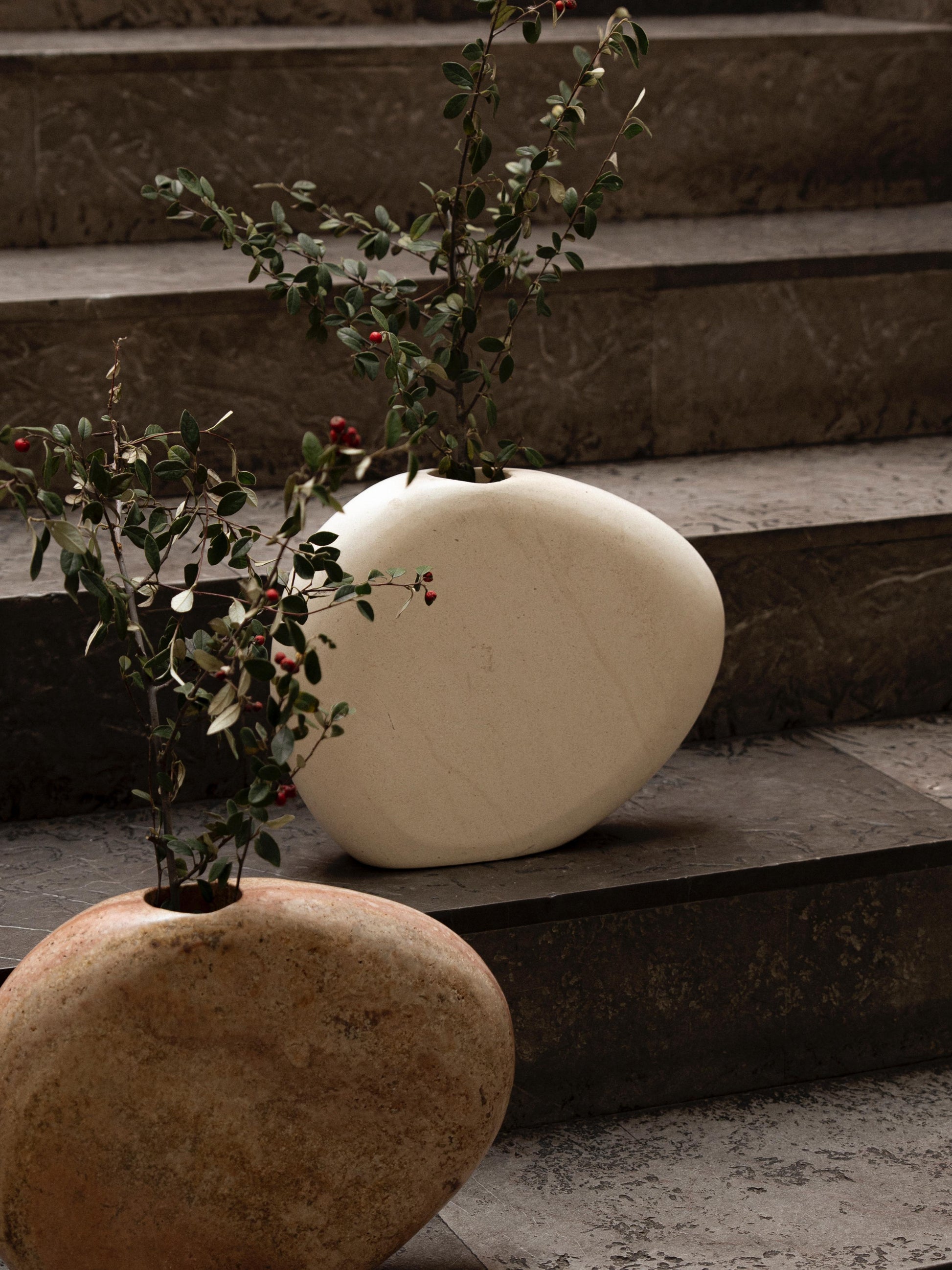 Nota: El mármol travertino rojo, café tabaco es una piedra natural porosa que, por su textura y apariencia, es ideal para usarse exclusivamente con flores y ramas secas.